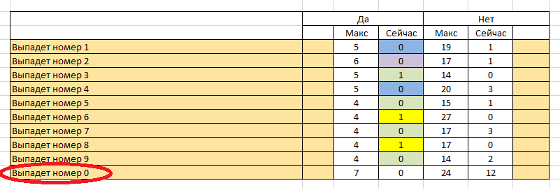 Номер «0» уже не выпадал 12 последних тиражей, а максимально он не выпадал подряд 24 тиража, но «За 6 до МАКС» этому значению ещё далеко, поэтому ячейка не подсвечивается. Интерес может представлять сам факт этого события, которое перешло 50% барьер в количественном выражении.