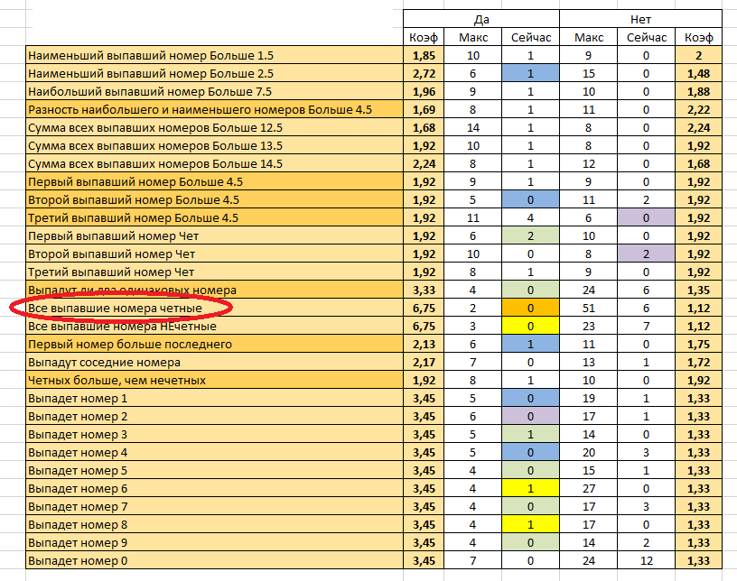 Событие «Все выпавшие номера чётные» уже не выпадало 6 последних тиражей, но максимально оно не выпадало подряд 51 тираж подряд и «За 6 до МАКС» этому значению ещё далеко, по этому ячейка не подсвечивается. А «Все выпавшие номера чётные», выпадало 2 тиража подряд и, хотя сейчас не выпало, между нулём и двойкой светится ячейка «За 2 до МАКС» потому, что между максимальным и текущим значениями всего лишь 2 тиража. При больших количествах тиражей, такое случается крайне редко.