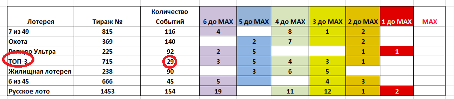 В детальной таблице мы видим, что за три тиража до максимального значения находятся два события: